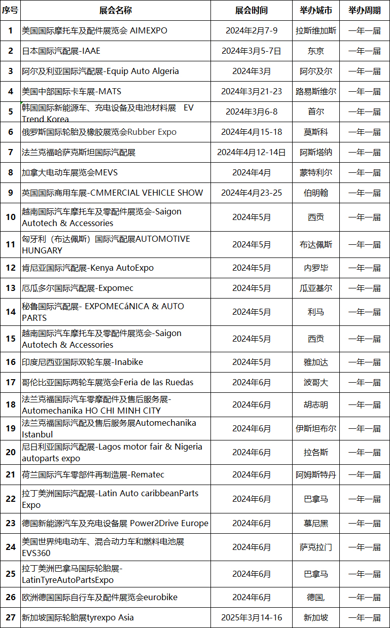 2024年全球國際汽配展會計劃表