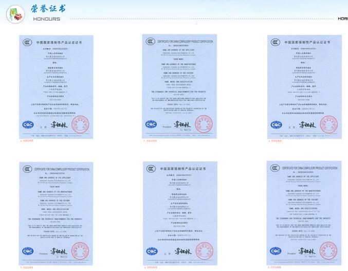 公司通過(guò)了ISO9001國(guó)際質(zhì)量體系認(rèn)證,認(rèn)證號(hào)為03814Q24383R3M;產(chǎn)品通過(guò)CCC認(rèn)證,認(rèn)證號(hào)為2002010401010432、2002010401018391、2006010401207349、2011010401467838;通過(guò)了歐盟CE認(rèn)證,認(rèn)證號(hào)為AN 50156622 0001、N8140680711002、CE-L092820-01、AN503316940001,通過(guò)了美國(guó)UL認(rèn)證,認(rèn)證號(hào)為E229599、E89593。